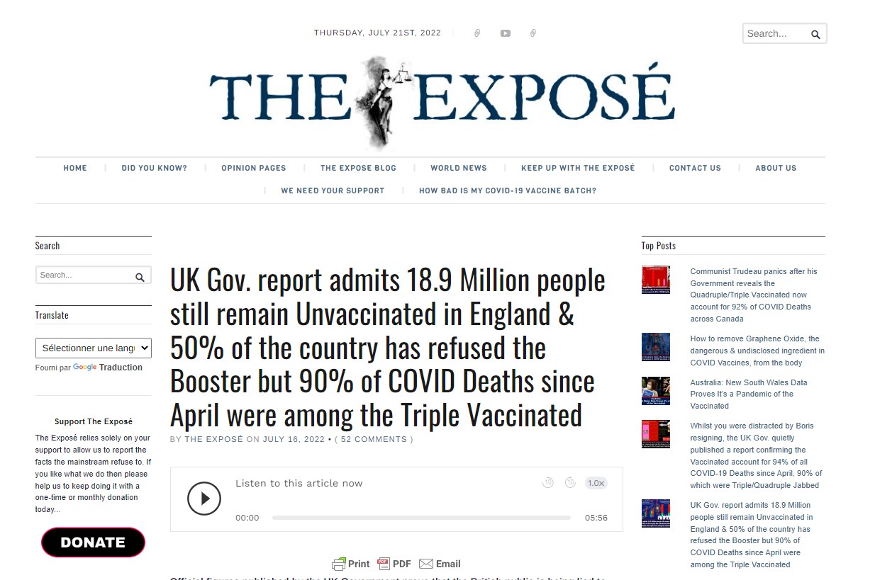 The Exposé pointe qu'entre avril et mai 2022, 4.935 décès liés au Covid-19 ont été enregistrés : 4.647 chez des personnes vaccinées au moins une fois, dont 4.216 étaient triplement vaccinées, contre 288 chez des personnes non-vaccinées.
