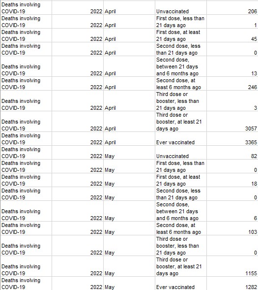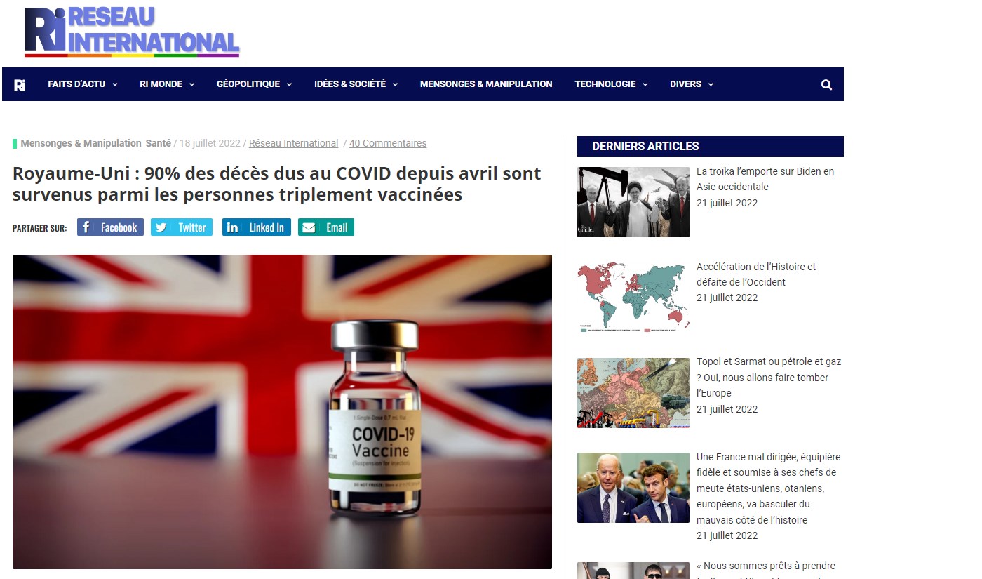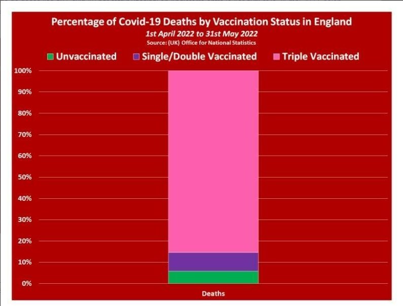 "Les chiffres publiés discrètement révèlent que la population vaccinée dans son ensemble a représenté un pourcentage choquant de 94% de tous les décès dus au Covid-19 en avril et mai 2022, les non-vaccinés ne représentant que 6% de tous les décès dus au Covid-19. Mais la statistique la plus effrayante est que 90% des décès parmi les vaccinés concernaient des personnes ayant reçu au moins trois doses, alors que seulement 50% de la population anglaises a reçu trois doses."