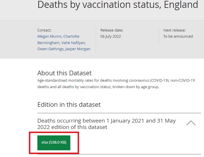 On les retrouve dans un document publié par l'ONS le 6 juillet 2022, portant sur la mortalité en Angleterre, entre le 1er janvier 2021 et le 31 mai 2022. Sous formes de tableaux, l'ONS publie le nombre de décès liés au Covid-19 selon les statuts vaccinaux. Pour y accéder, il faut télécharger le dernier tableau de statistiques disponible en cliquant sur ce bouton, puis se rendre sur le tableau numéro 1.