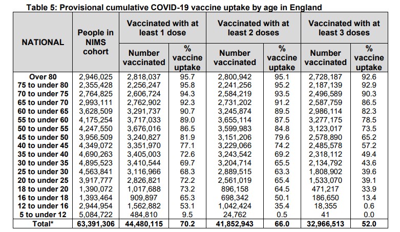 En Angleterre, selon le dernier point hebdomadaire publié par l'agence sanitaire britannique, le 7 juillet 2022, 70% de la population de plus de 5 ans, soit plus de 44 millions de personnes, avait reçu au moins une dose de vaccin anti-Covid, 66% en ayant reçu au moins deux, et 52% au moins trois doses (page 65).