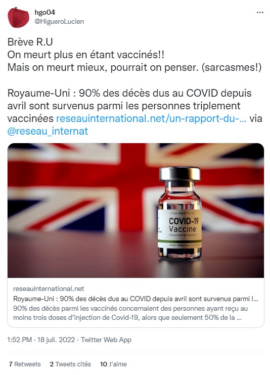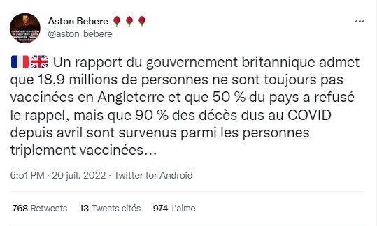 "Un rapport du gouvernement britannique admet que 90% des décès dus au Covid depuis avril sont survenus parmi les personnes triplement vaccinées", affirment plusieurs publications partagées sur Twitter et Facebook (ici, ici ou ici), sous-entendant que les vaccins sont donc inutiles, voire dangereux.