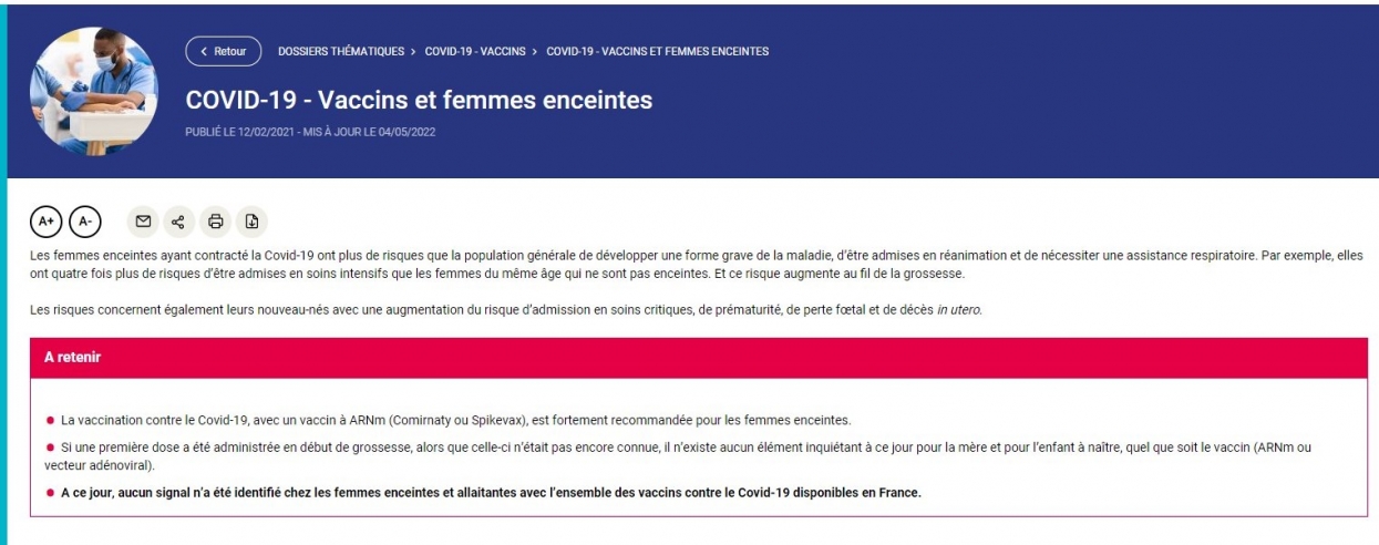 On peut consulter ici le dossier de l'ANSM sur les vaccins contre le Covid et les femmes enceintes. "A ce jour, aucun signal n'a été identifié chez les femmes enceintes et allaitantes avec l'ensemble des vaccins contre le Covid-19 disponibles en France", est-il clairement indiqué.