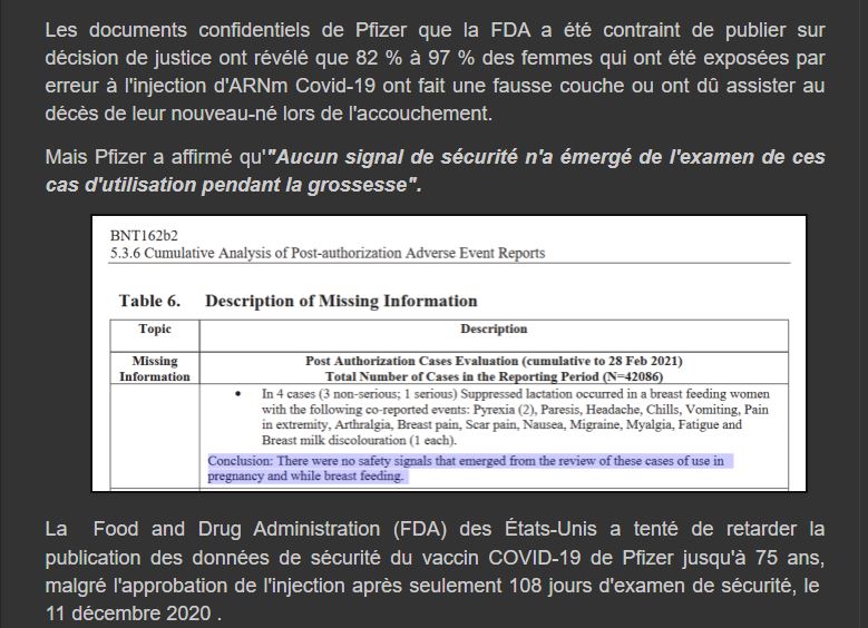 "Les documents confidentiels de Pfizer que la FDA a été contraint de publier sur décision de justice ont révélé que 82 % à 97 % des femmes qui ont été exposées par erreur à l'injection d'ARNm Covid-19 ont fait une fausse couche ou ont dû assister au décès de leur nouveau-né lors de l'accouchement", affirment des auteurs de billets de blogs ou de tweets en français. L'affirmation a également largement circulé en espagnol sur Twitter et Facebook (1, 2, 3, 4).