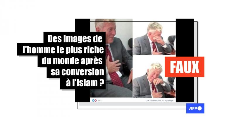 Une publication partagée plus d’un millier de fois sur Facebook prétend montrer, images à l’appui, "l’homme le plus riche du monde" fondant en larmes après sa "conversion à l’islam". C’est faux : ces clichés proviennent d’une vidéo qui a beaucoup circulé en 2018 et dans laquelle n'apparaissent aucune des grandes fortunes mondiales.