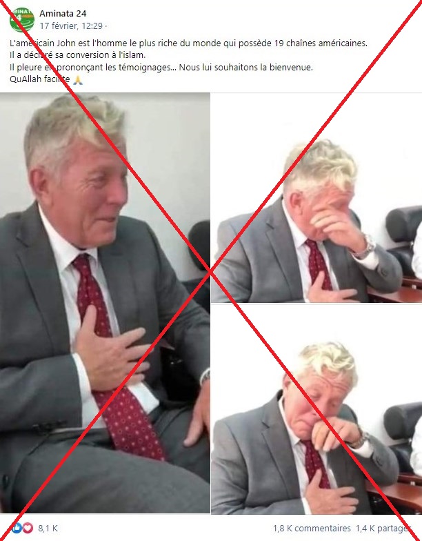 "L'américain John est l'homme le plus riche du monde qui possède 19 chaînes américaines. Il a déclaré sa conversion à l'Islam", décrit l’auteur de la publication, en légende. "Il pleure en prononçant les témoignages", ajoute-t-il.