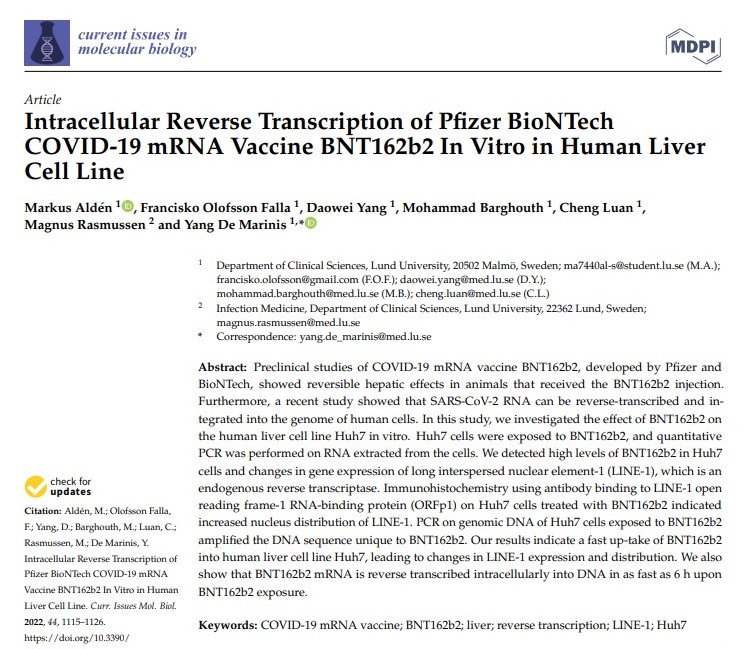 "Dans cette étude, nous présentons la preuve que le vaccin Covid-19 à ARN messager BNT162b2 peut pénétrer la lignée cellulaire Huh7 in vitro. Le [vaccin] est retro-transcrit de façon intracellulaire dans l'ADN après 6 heures d'exposition in vitro" au produit, écrivent les auteurs, de l'Université de Lund en Suède.
