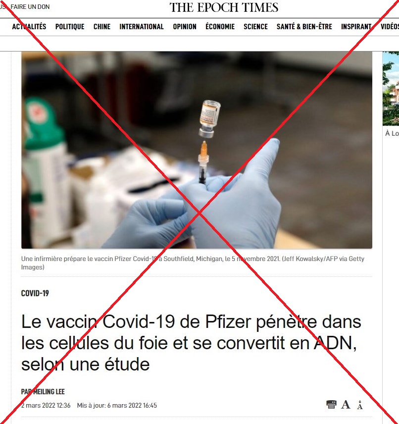 Le titre d'un article du Epoch Times est catégorique : "le vaccin Covid-19 de Pfizer pénètre dans les cellules du foie et se convertit en ADN, selon une étude". Publié le 2 mars, le texte affirme que "L’ARN messager (ARNm) du vaccin Covidâ€'19 de Pfizer est capable de pénétrer dans les cellules du foie humain et de se convertir en ADN, selon des chercheurs suédois de l’université de Lund". ll a été partagé plus d'une centaine de fois depuis sur des pages et comptes publics Facebook depuis, selon le logiciel de mesure d'audience des réseaux sociaux Crowdtangle.