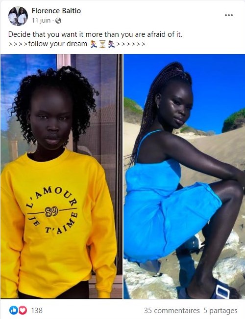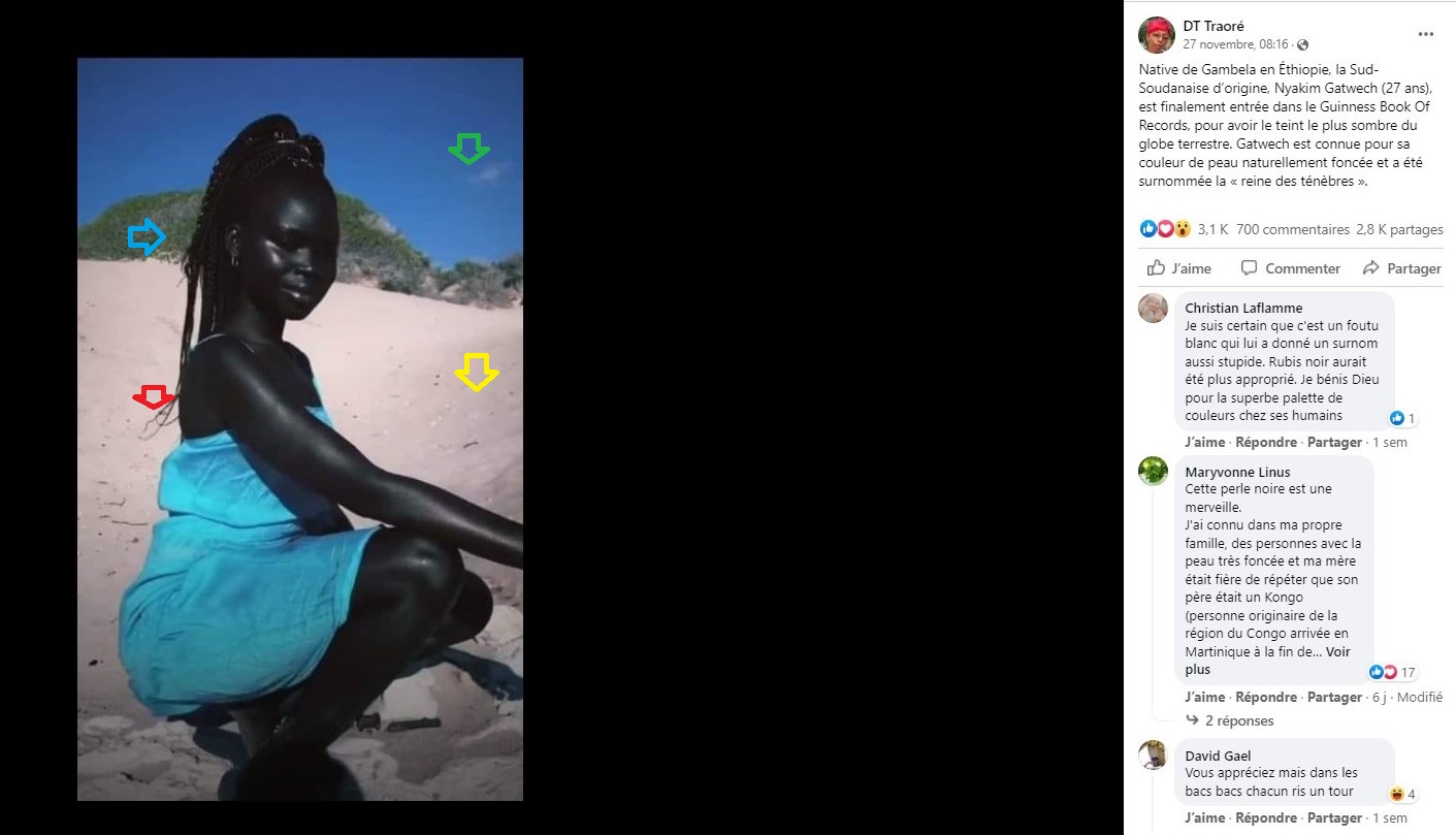 "Native de Gambela en Éthiopie, la Sud-Soudanaise d’origine, Nyakim Gatwech (27 ans), est finalement entrée dans le Guinness Book Of Records, pour avoir le teint le plus sombre du globe terrestre", affirme un message largement relayé sur Facebook (1,2,3,4…) et Twitter (1 et 2). Les commentaires d’internautes sont élogieux envers la supposée heureuse élue. Associée à cette affirmation, on voit l'image d'une jeune femme noire, au teint très sombre, accroupie dans un décor de sable. Elle est vêtue d’une robe bleu clair et affiche un sourire timide.