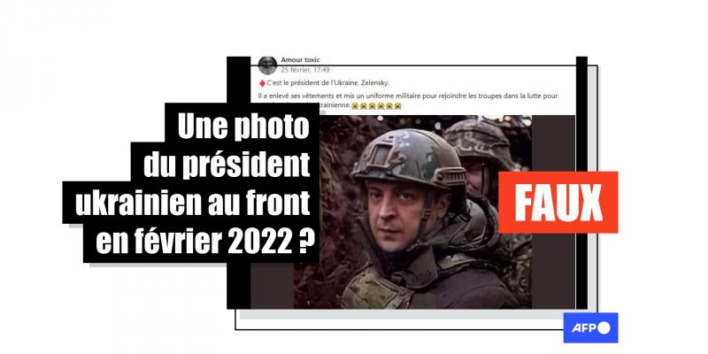 Une photo du président ukrainien Volodymyr Zelensky en tenue de camouflage et gilet pare-balles circule sur les réseaux sociaux depuis le 25 février 2022: elle est censée le montrer aux côtés de ses troupes, lors de l’invasion russe. En réalité, cette image est antérieure à l'actuel conflit en Ukraine. Elle a été prise l’an dernier lors d'une visite de Zelensky dans la région séparatiste pro-russe du Donbass, en Ukraine.