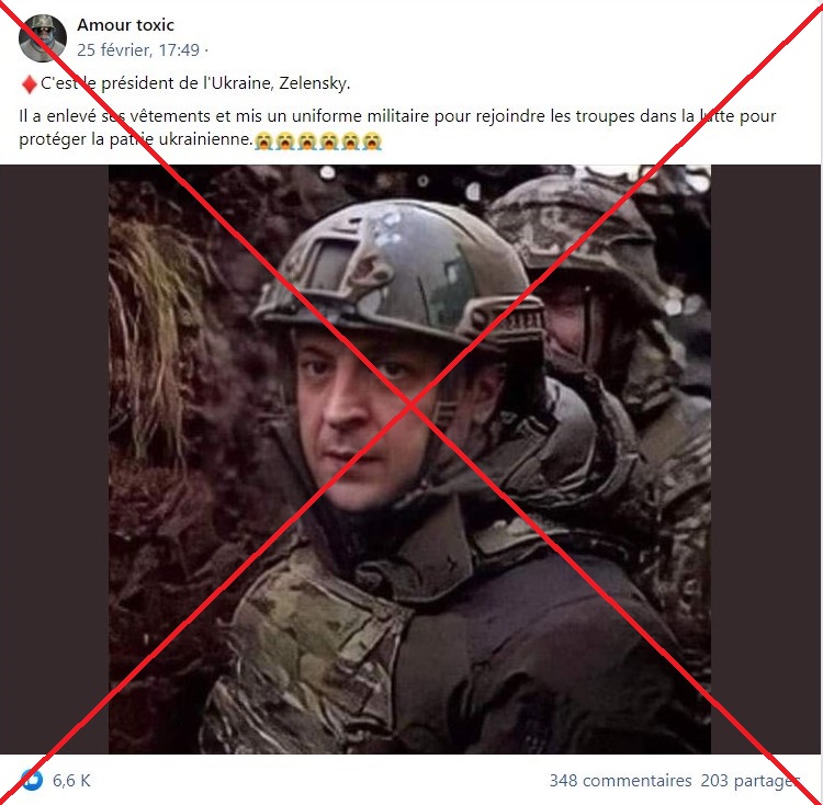 Plusieurs photos du président ukrainien en tenue militaire ont été partagées sur les réseaux sociaux, depuis le 25 février, pour raconter son parcours ou le féliciter d'être en première ligne pour repousser l'avancée russe vers les villes clés de l’Ukraine (1, 2, 3...). L'une de ces images, une photo-portrait, est accompagnée d'un message laudateur : "C'est le président de l'Ukraine Zelensky". "Il a enlevé ses vêtements et mis un uniforme militaire pour rejoindre les troupes dans la lutte pour protéger la patrie ukrainienne. C'est un vrai leader", indique par exemple l'auteur d'un post partagé plus de 200 fois en Afrique francophone.
