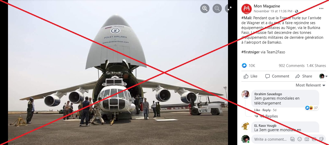 Une photo partagée plus de 4.000 fois depuis le 19 novembre sur Facebook prétend montrer "des tonnes d'équipements militaires de dernière génération" livrées par la Russie à "l'aéroport de Bamako" au Mali. Attention: la photo virale montre en réalité la livraison d'hélicoptères russes destinés aux opérations de secours humanitaire au Burundi en 2004.