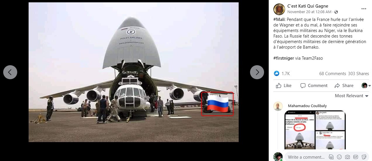 Un imposant avion gris est arrêté sur le tarmac d'un aéroport. Sur son fuselage s'étalent les mots "Polet Airlines" ainsi qu'un drapeau russe accompagné de la mention "Russia". A l'intérieur, on aperçoit un hélicoptère blanc en train d'être déchargé par une dizaine de personnes, certaines d'entre elles portant un treillis. Selon les internautes qui la partagent, cette image montre les "tonnes d'équipements militaires de dernière génération" tout juste livrées par la Russie "à l'aéroport de Bamako", capitale du Mali.