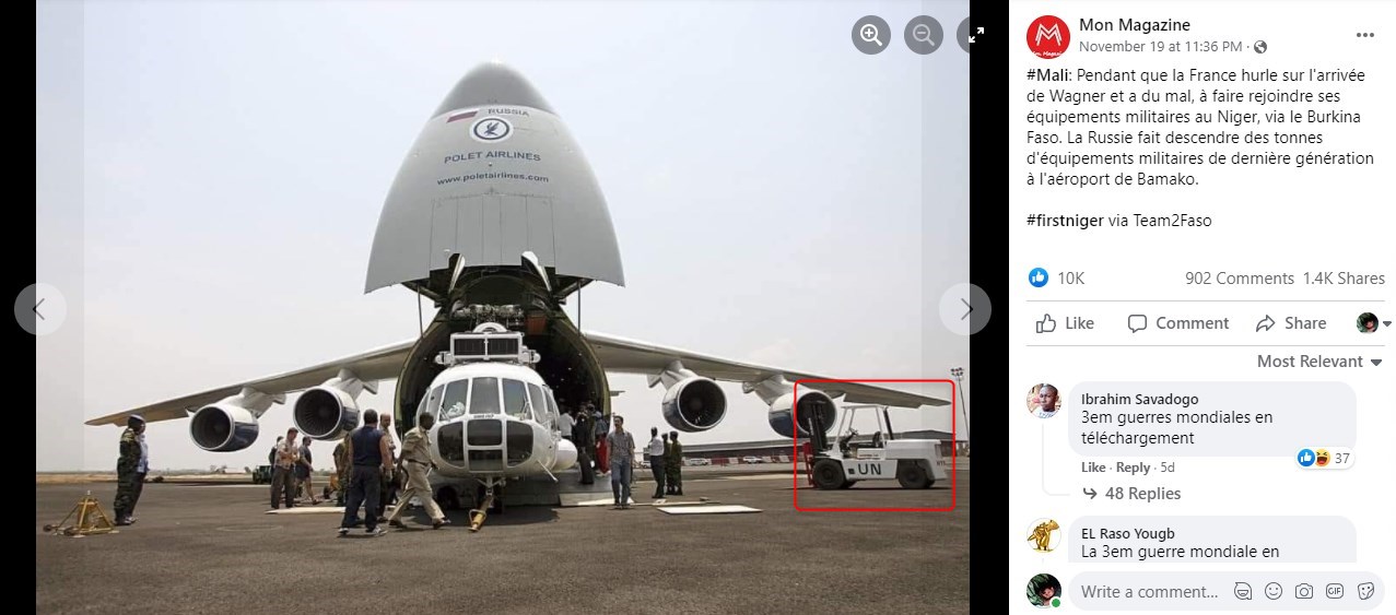 Contactée par l'AFP, l'autrice de cette photographie, Martine Perret, confirme que cette photo n'a "rien à voir" avec une récente livraison d'armes au Mali. "C'était l'arrivée des hélicoptères des Nations unies à bord de l'Antonov, en 2004, au Burundi", se remémore-t-elle, "dans le cadre de l'opération des Nations Unies là-bas, l'ONUB [Opération des Nations Unies au Burundi]".