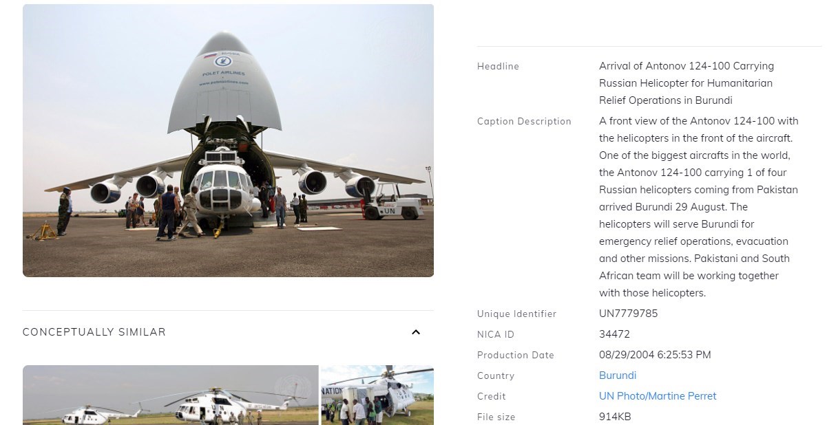 Une recherche d'image inversée sur le moteur de recherche TinEye permet en effet de la retrouver sur le site des Nations unies (ONU) consacré aux contenus multimédia de l'organisation internationale. Elle a été prise en 2004 au Burundi et montre l'arrivée d'un avion, un Antonov 124-100, "transportant un des quatre hélicoptères russes dédiés aux opérations de secours humanitaires" dans le pays.
