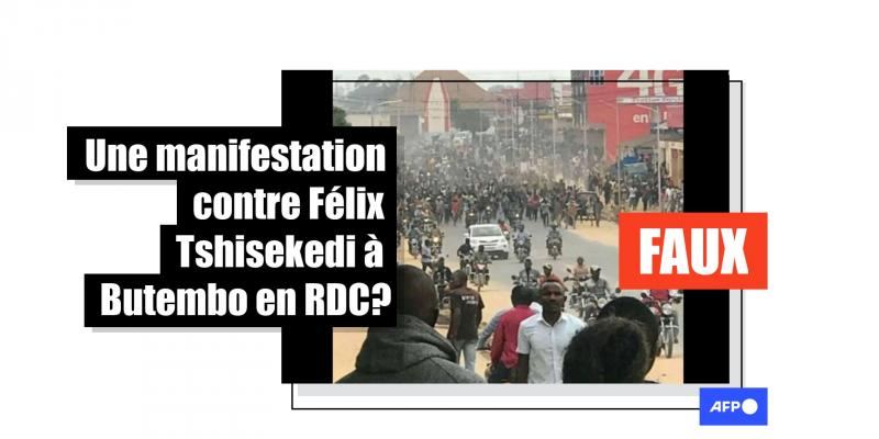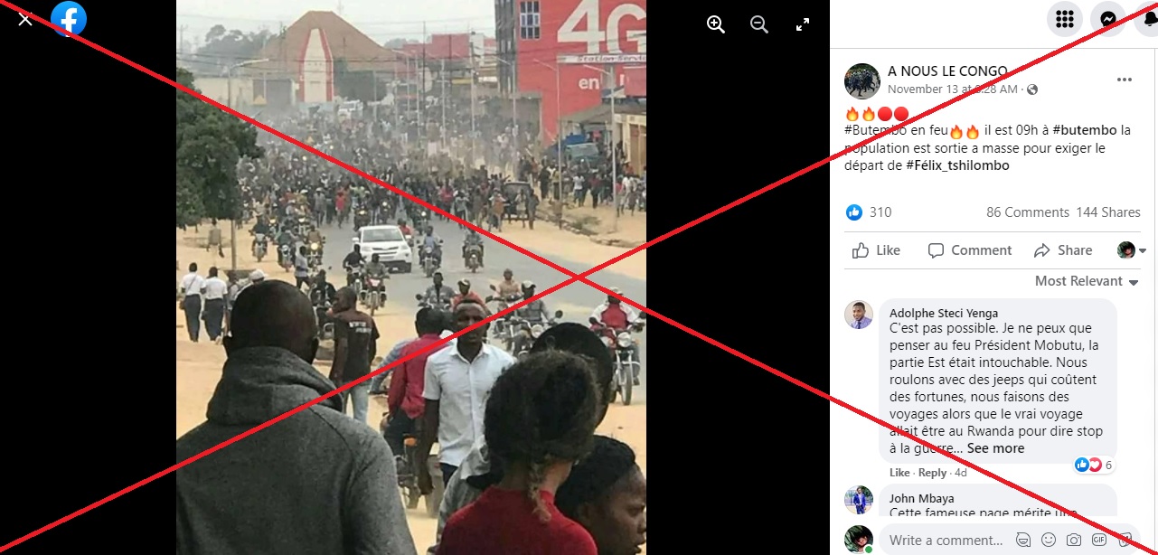 Une photo partagée près de 150 fois depuis le 13 novembre prétend montrer une manifestation hostile au président de la République démocratique du Congo, Félix Tshisekedi, à Butembo, dans l'est du pays. Attention: cette image date en réalité de juin 2019 et a été prise à Bunia, à 300 kilomètres au nord de Butembo, lors d'une manifestation organisée par la communauté Hema, une ethnie de l'est de la RDC.