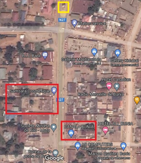 Sur le boulevard de la Libération, dans le centre de Bunia: c'est ce qu'indiquent l'article de juin 2019, ainsi qu'une analyse croisée de plusieurs autres photos de cet endroit glanés sur des médias locaux (Bunia Actualié et Tam-Tam News) et de Google Street View.