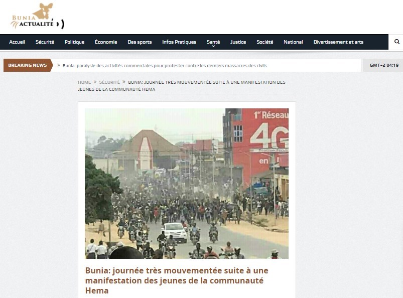 "La photo est authentique": elle a été prise "le même jour que la manifestation" des jeunes Hema mentionnée dans l'article, précise-t-il à l'AFP, et montre "l'activité de ce jour-là". Selon l'article de 2019, cette marche était en effet organisée pour exprimer le mécontentement des jeunes de cette communauté par rapport aux massacres dont étaient victimes des membres de leur ethnie en territoire de Djugu (au nord et à l'est de la ville de Bunia).