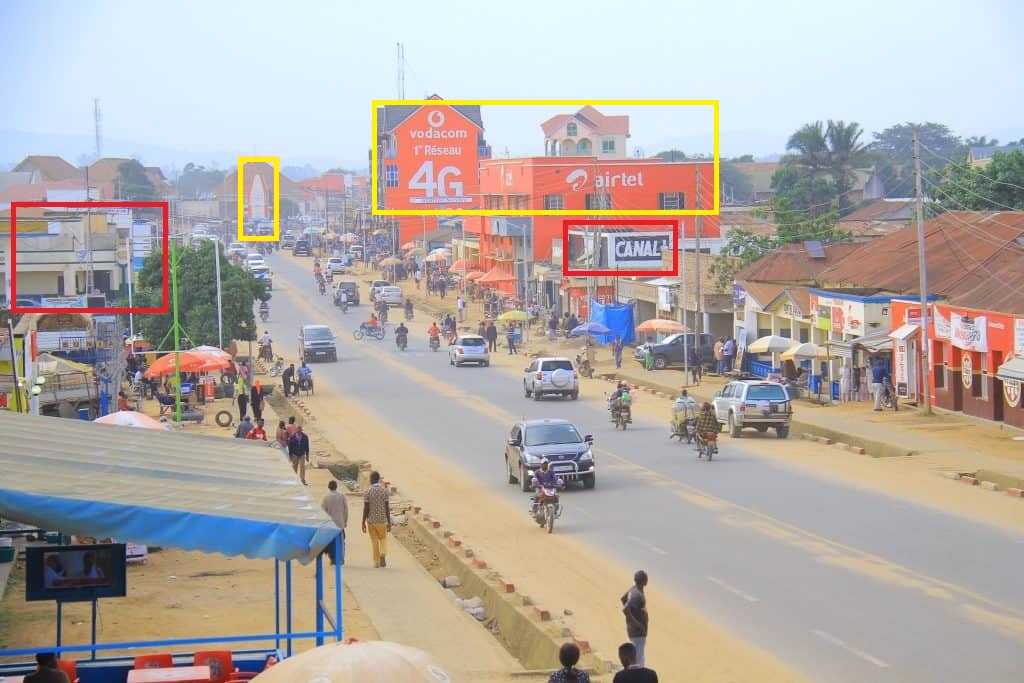 On voit par exemple dans ces deux images certains éléments identiques à ceux visibles dans l'image virale: le panneau rouge et blanc au milieu de la route, ainsi que les bâtiments rouges (rectangles jaunes). Sur Google Street View, on retrouve également ce même dispositif publicitaire en forme de cône (rectangle jaune), ainsi que la boutique Canal + et la station-essence visible sur les deux photos que nous étudions (rectangles rouges).