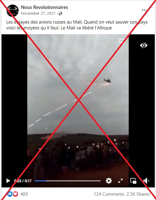 Une vidéo montrant un hélicoptère faisant feu à quelques centaines de mètres d'une foule a été partagée plus de 2.500 fois depuis le 27 novembre sur Facebook. Selon les internautes qui la font circuler, elle montrerait des vols d'essais "des avions russes au Mali". Une affirmation qui fait écho aux tensions entre plusieurs pays occidentaux et le gouvernement malien au sujet de l'influence russe dans le pays. Attention: cette vidéo a été tournée en 2020 et montre en réalité une démonstration de l'armée sud-africaine.