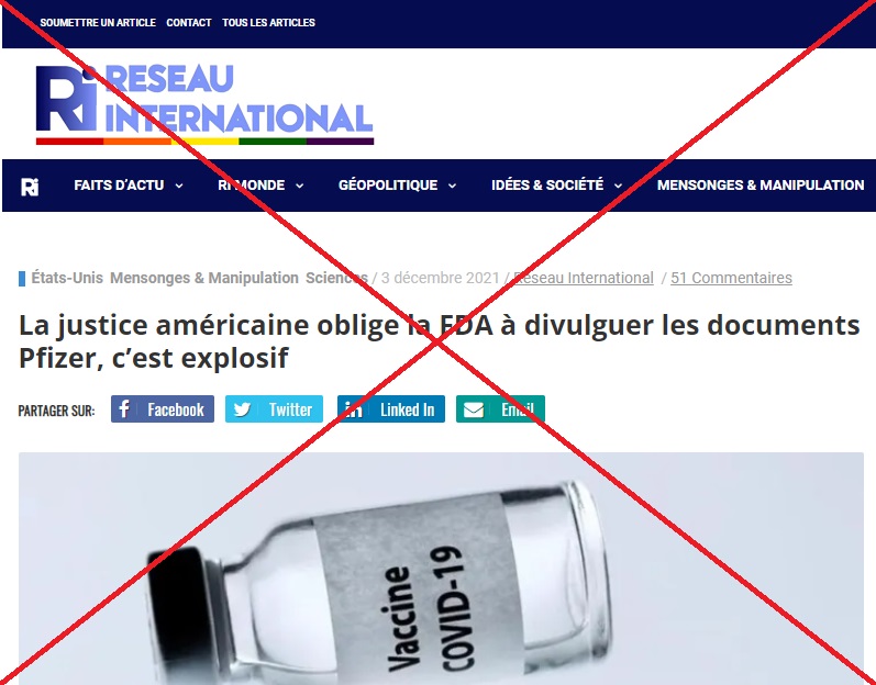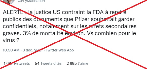 Des documents "confidentiels" divulgués par la FDA, l'agence américaine du médicament, révéleraient que lors des essais du vaccin Pfizer-BioNTech, plus de 1.200 personnes - "3%" des participants - seraient morts, affirment des articles très partagés sur Internet depuis début décembre. C'est faux : le document mis en avant n'est pas relatif aux essais cliniques de Pfizer mais recense des effets secondaires signalés début 2021, dont le lien avec la vaccination n'est pas avéré. Il conclut par ailleurs à l'efficacité et la sécurité de ce vaccin, ont affirmé Pfizer et la FDA auprès de l'AFP, ce que confirment des recherches scientifiques menées jusqu'à ce jour.