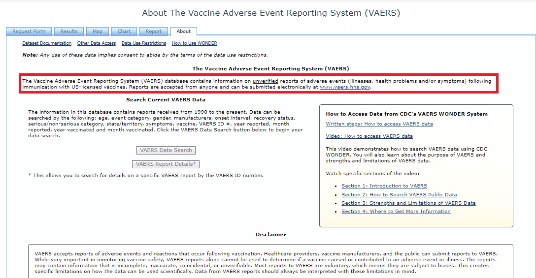 Avant d'accéder aux données du VAERS, tout utilisateur doit ainsi reconnaître avoir lu et compris les mentions légales du système. Le guide d’interprétation des données précise bien rapporter "les événements et réactions qui se produisent après la vaccination", mais pas nécessairement à cause d'elle. Pour cette raison, "les rapports VAERS ne peuvent pas être utilisés seuls pour déterminer si un vaccin a causé ou contribué à un événement indésirable ou une maladie", avertit le site.