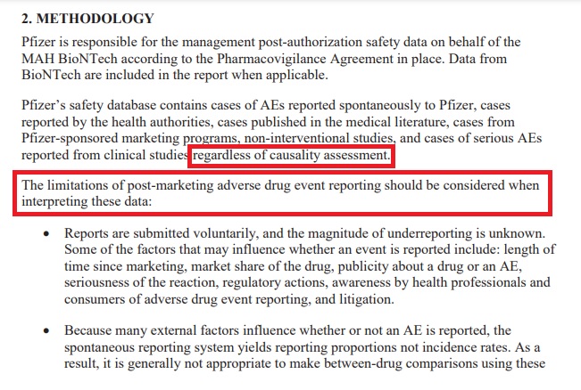 De plus, le document n'indique nulle part que le vaccin est directement lié à ces décès. Les causes de ceux-ci ne sont pas précisées. Ainsi, des personnes atteintes de "maladies diverses", comme des cancers ou maladies cardiovasculaires, et décédées de celles-ci après avoir été vaccinées, ont pu être comptabilisés dans ces chiffres, a précisé Dervila Keane, porte-parole de Pfizer auprès de l'AFP début décembre.
