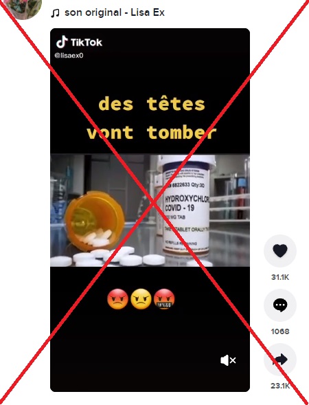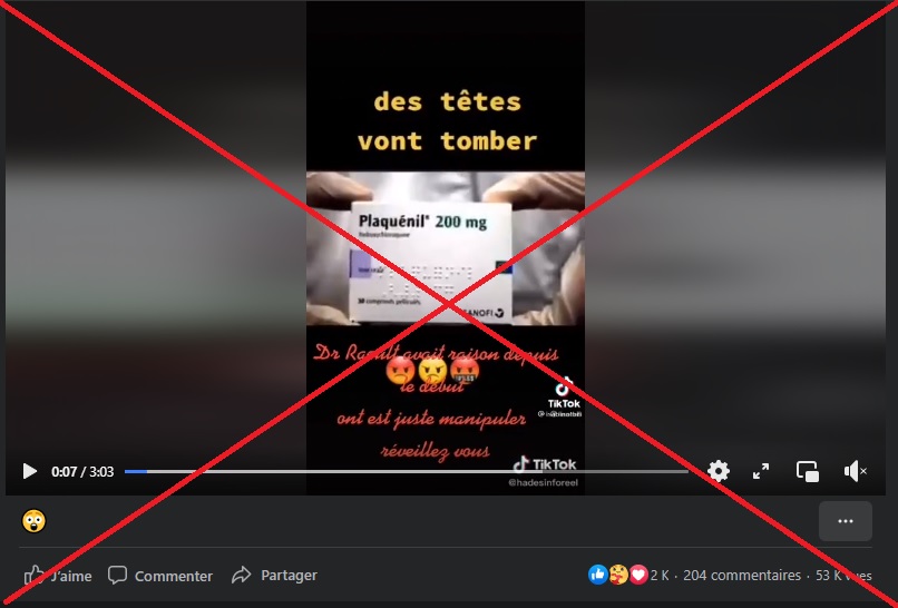 Des résultats qui viennent de "tomber" démontreraient que "les trois quarts" des études sur l'hydroxycholoroquine "concluent à son efficacité" contre le Covid-19, selon une vidéo vue plus de 53.000 fois sur Facebook et aimée par plus de 31.000 personnes sur TikTok. C'est doublement infondé : la vidéo en question est un extrait tronqué de la bande-annonce du film "Mal traités" sorti en décembre 2020. Les études mentionnées alors ne permettaient pas de prouver l'efficacité de l'hydroxychloroquine en 2020, et celle-ci n'est par ailleurs toujours pas avérée en 2021.