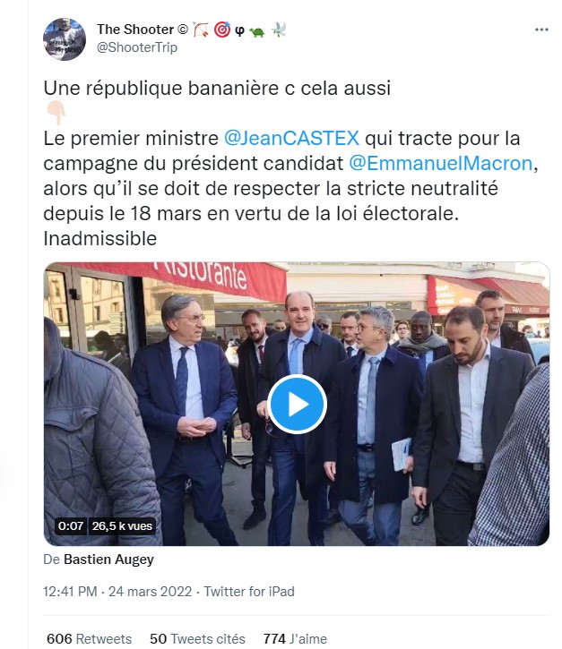 A l'approche du scrutin présidentiel, des internautes reprochent à Jean Castex - vidéo à l'appui - d'avoir distribué illégalement des tracts de soutien à Emmanuel Macron. Selon eux, il aurait ainsi enfreint la période de réserve imposée aux membres du gouvernement depuis le 18 mars. Si cette séquence est authentique, Jean Castex n'a pas enfreint la période de réserve, comme le soulignent deux juristes à l'AFP. Il reste libre de soutenir un candidat à condition de le faire distinctement de son statut de ministre et sans recourir à des moyens publics. Deux critères qui étaient réunis lors de son déplacement au Raincy, selon Matignon et ce déplacement a été géré par l'équipe de campagne et non les services du Premier ministre d'après un journaliste de l'AFP.