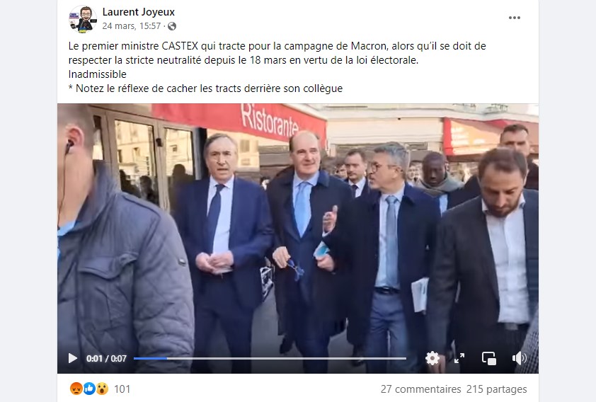 "Observez bien Castex, ce Premier ministre de pacotille, cacher les tracts pour Macron quand il réalise qu'il est filmé... car il a interdiction de faire ça durant la campagne", "le Premier ministre Castex [...] tracte pour la campagne de Macron, alors qu’il se doit de respecter la stricte neutralité depuis le 18 mars en vertu de la loi électorale", dénoncent par exemple les légendes de deux publications (1, 2) montrant cette séquence de sept secondes où l'on voit le Premier ministre, des tracts à la main, avancer dans une rue aux côtés d'un petit groupe de personnes.