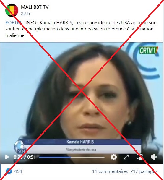 Dans son journal télévisé du 22 février, à 20h, l’Office de radio et télévision du Mali (ORTM) annonce que “Kamala Harris, la vice-présidente des Etats-Unis, apporte son soutien au peuple malien”. Le présentateur du journal affirme que dans une interview “en référence à la situation malienne”, Kamala Harris estime que les populations ont le droit de choisir leur propre gouvernance et les Nations ont le droit de choisir leurs alliances. “Je vous propose de l’écouter”, dit-il, avant de lancer un extrait d’une prise de parole de la vice-présidente américaine.