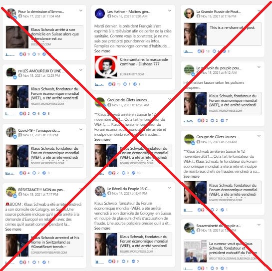 "Klaus Schwab, fondateur du Forum économique mondial (WEF), a été arrêté vendredi (12 novembre, ndlr) à son domicile de Cologny, en Suisse, et inculpé de plusieurs chefs d’accusation de fraude", titre cet article, partagé plus de 600 fois sur Facebook depuis le 14 novembre 2021. Selon l'auteur, "une source policière précise qu’il a été arrêté à la demande d’Europol en relation avec des crimes qu’il aurait commis pendant la pandémie COVID-19 (...) et est actuellement placé en détention."