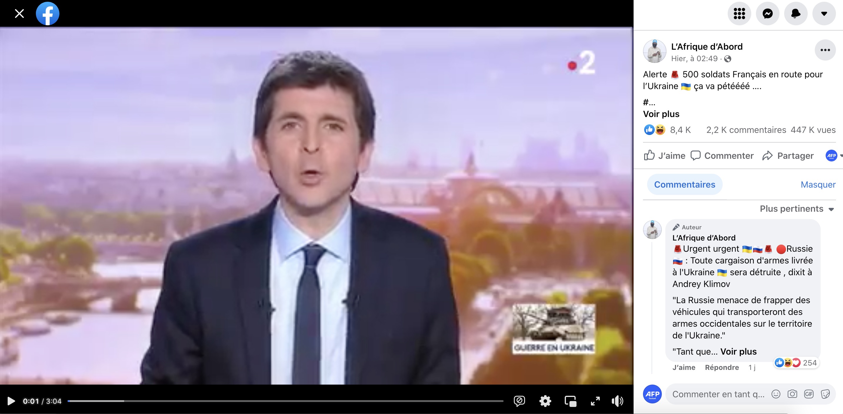 "500 soldats Français en route pour l'Ukraine, ça va péter", affirment des publications virales, partagées plus de 1700 fois en 24 heures sur Facebook en France et dans plusieurs pays d'Afrique. C'est faux, comme l'a confirmé à l'AFP le ministère des armées français. Par ailleurs, le reportage de France 2 sur lequel est supposé se baser l'affirmation ne mentionne à aucun moment un déploiement en Ukraine. Une autre rumeur circulant sur les réseaux sociaux évoque des Français partis en Ukraine avec l'aval de la Légion étrangère. Une affirmation démentie par l'Armée de Terre.