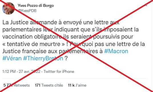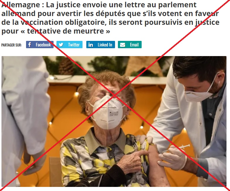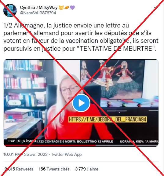 "Allemagne : La justice envoie une lettre au parlement allemand pour avertir les députés que s'ils votent en faveur de la vaccination obligatoire, ils seront poursuivis pour 'tentative de meurtre'", assurent plusieurs articles de blogs (1, 2, 3) partagés plusieurs milliers de fois depuis le 27 avril.