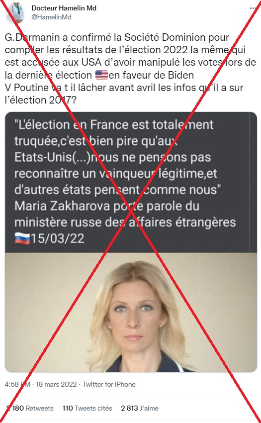 "G.Darmanin a confirmé la Société Dominion pour compiler les résultats de l'élection 2022 la même qui est accusée aux USA d’avoir manipulé les votes lors de la dernière élection", prétendent des tweets (ici, là) partagés à plusieurs milliers de reprises depuis le 18 mars, et dont les textes ont été largement repris sur Facebook, VKontakte et sur des sites.