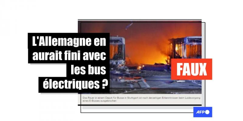 L'Allemagne en aurait "fini" avec "les bus électriques", selon une publication relayée des milliers de fois sur les réseaux sociaux. Sa source ? L'article d'un quotidien allemand qui indiquerait que ces véhicules ont été "interdits dans la ville de Munich" après un incendie. L'article ne dit pas cela, et la compagnie de transports munichoise a démenti cette affirmation auprès de l'AFP, expliquant que huit de ses véhicules ont été retirés temporairement de la circulation en octobre pour des vérifications, mais que des bus électriques circulent bien aujourd'hui. Le ministère fédéral des transports allemands a confirmé auprès de l'AFP que les bus électriques sont bien autorisés en Allemagne, et circulent dans plusieurs villes.