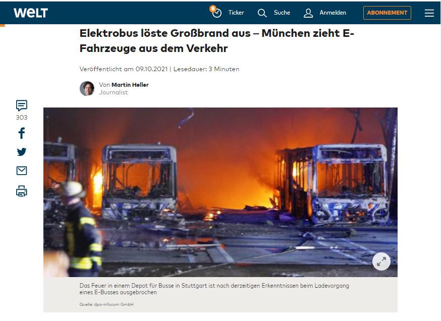 Cet article indique que quelques jours après un incendie survenu fin septembre dans un dépôt de bus à Stuttgart, la Münchner Verkehrsgesellschaft (MVG), la société qui gère les transports en communs dans la ville de Munich, a retiré temporairement certains de ses bus électriques de la circulation, pour des vérifications.