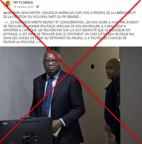 Une publication virale sur une page Facebook pro-Laurent Gbagbo prétend que Georges Winchester, un sénateur américain, a adressé son soutien à l’ancien président ivoirien. La déclaration aurait été diffusée sur CNN à quelques jours du lancement du nouveau parti politique de Laurent Gbagbo. C’est faux. L’AFP n'a trouvé aucune trace de ce sénateur ni sur le site du Sénat américain ni sur CNN. Ce sénateur n'existe pas. Contacté, l’entourage de Laurent Gbagbo confirme ne pas être au courant d’un tel soutien.
