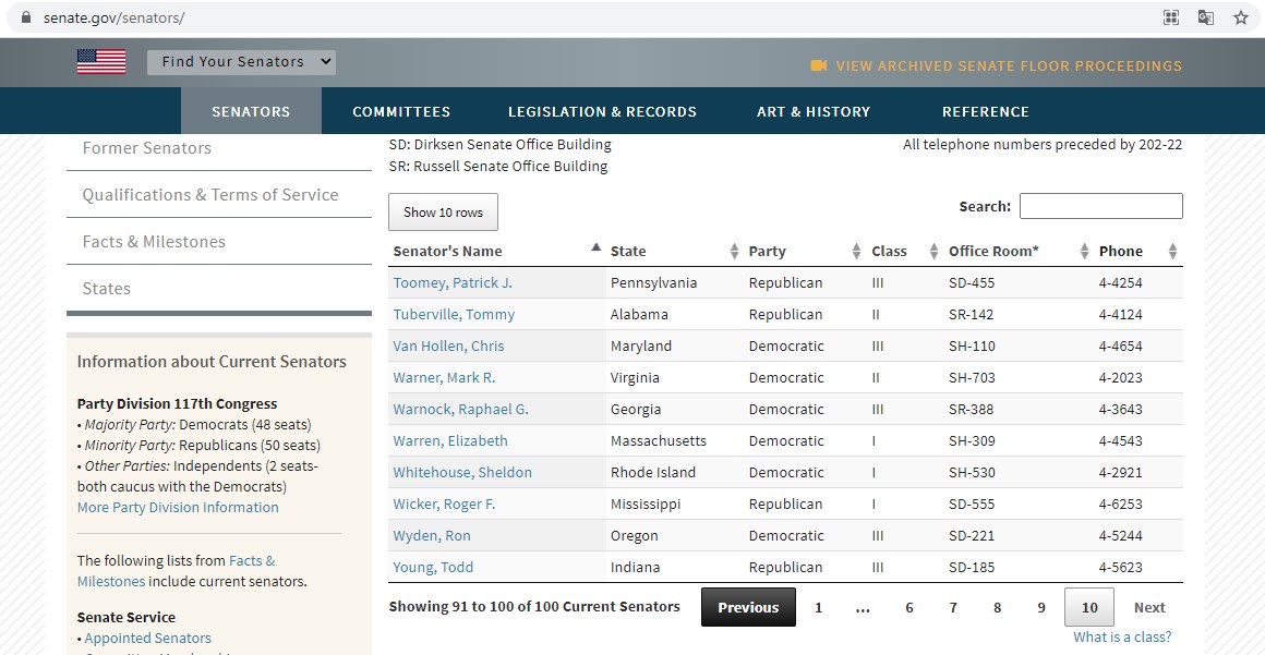 L’AFP a parcouru la liste des 100 sénateurs américains en fonction sur le site officiel du Sénat, la chambre haute du congrès. Les sénateurs y sont classés par ordre alphabétique en fonction de leur nom de famille, pourtant le nom Winchester n'apparaît pas à la lettre "W".