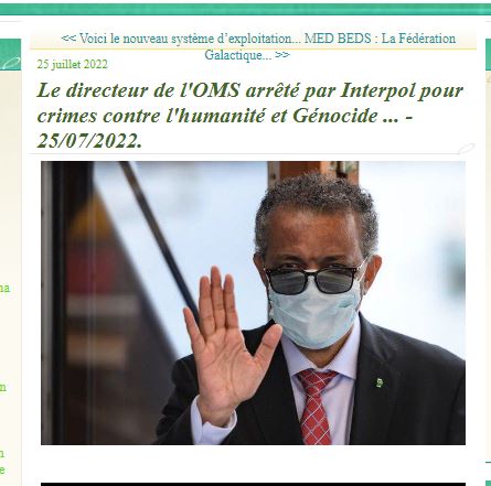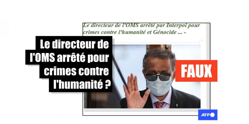 "Le directeur de l'OMS arrêté par Interpol pour crimes contre l'humanité et génocide", affirme un billet de blog partagé plusieurs centaines de fois sur les réseaux sociaux d'après les chiffres de l'outil de mesure d'audience CrowdTangle. Il renvoie vers un autre site, le Vancouver Times.