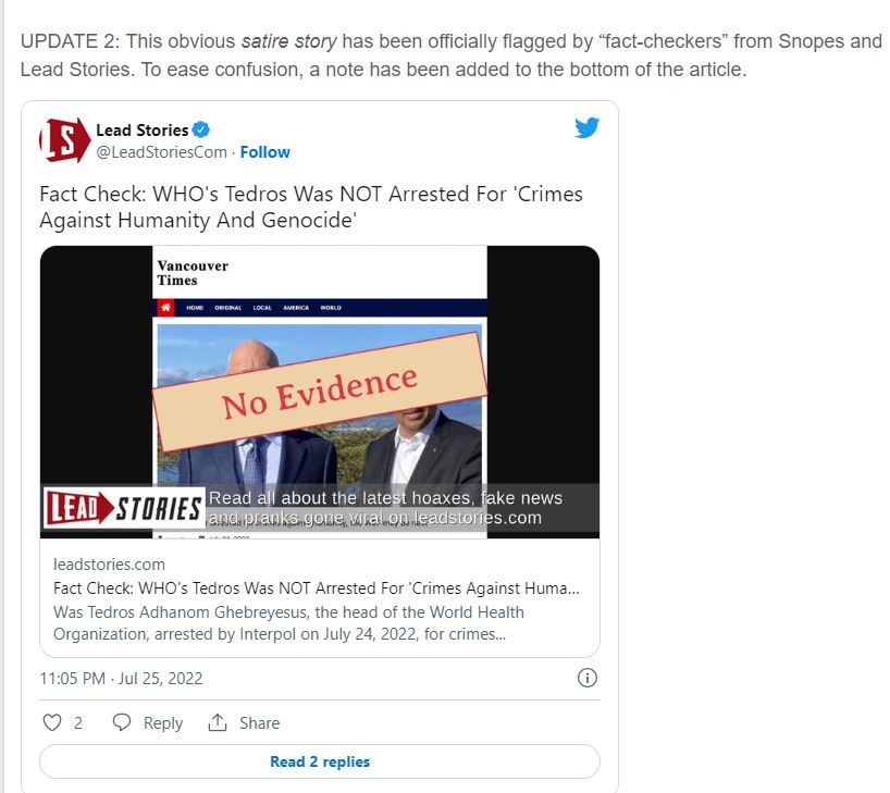 Le texte a en effet été publié sur le site satirique Vancouver Times le 24 juillet 2022, avec pour titre "Le directeur de l'OMS arrêté pour crimes contre l'humanité, le directeur du Forum économique mondial pourrait être le suivant".