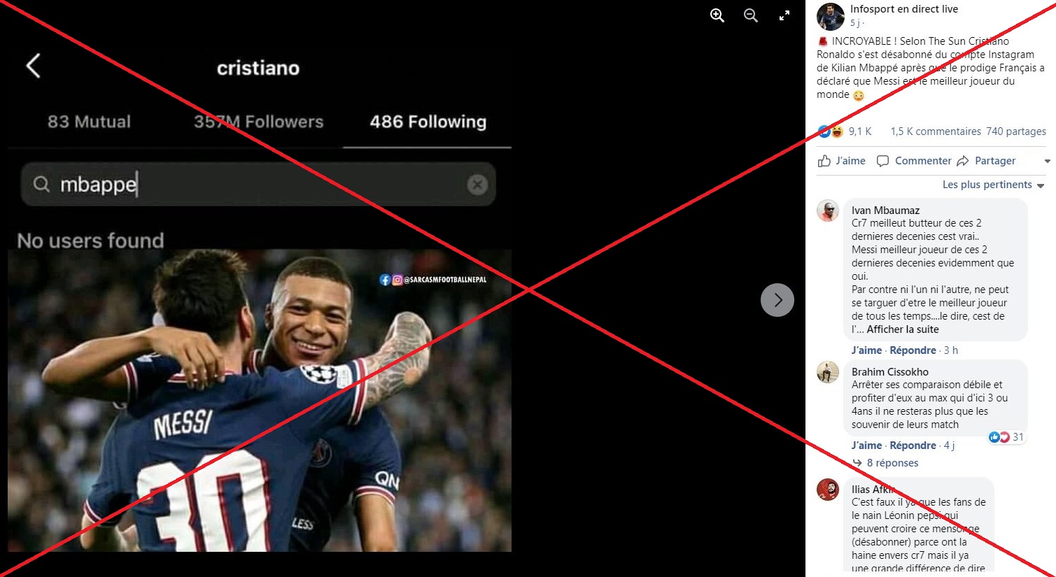 "INCROYABLE ! Selon The Sun Cristiano Ronaldo s'est désabonné du compte Instagram de Kilian Mbappé après que le prodige Français a déclaré que Messi est le meilleur joueur du monde", écrit l’auteur d’une publication partagée près de 800 fois sur Facebook, depuis le 20 octobre.