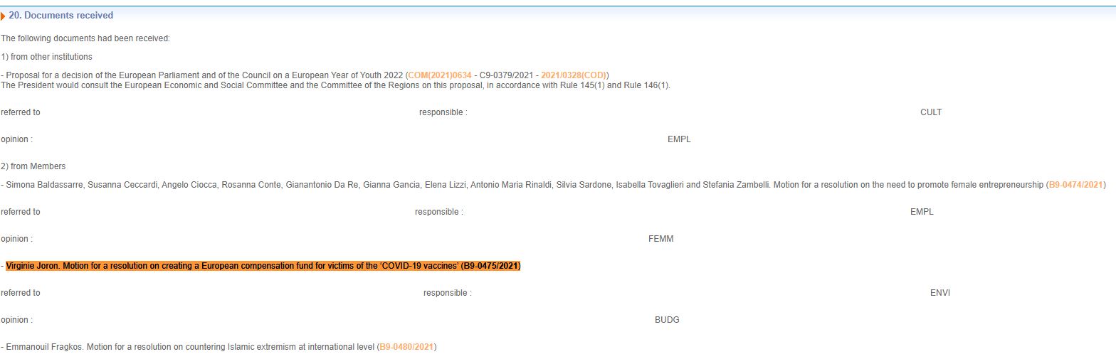 Si une proposition de résolution concernant la création d'un "fonds européen d'indemnisation des victimes des vaccins contre l[e] Covid-19" a bien été déposée le 23 septembre, c'est à l'initiative d'une seule eurodéputée française Virginie Joron (Rassemblement national) et non celle du Parlement européen, a confirmé l'institution européenne à l'AFP le 9 novembre.