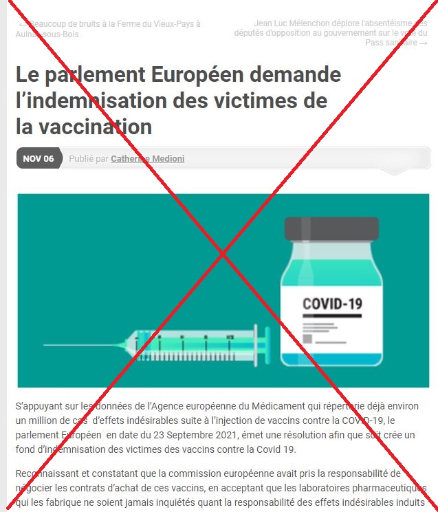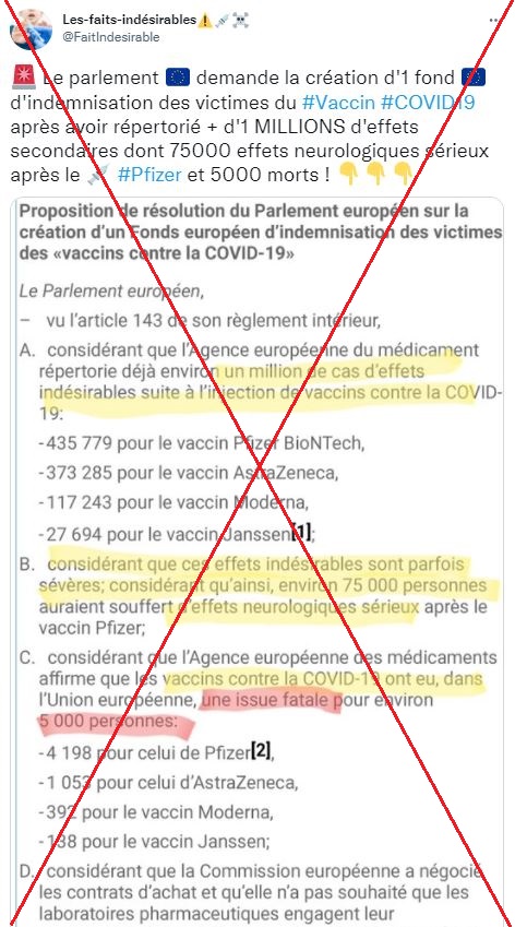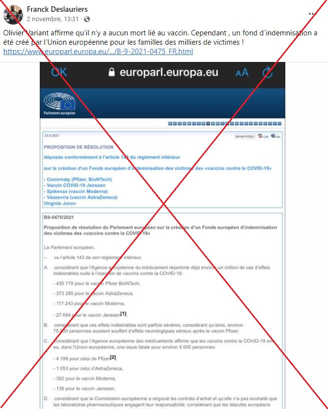 Des publications relayées plus de 1.500 de fois en une semaine soutiennent qu'un "fonds d'indemnisation a été créé par l'Union européenne" pour les familles des "milliers de victimes de la vaccination" anti-Covid. C'est faux : ces publications s'appuient sur une proposition de résolution déposée par une eurodéputée et non par le Parlement européen, a indiqué l'institution européenne à l'AFP. Par ailleurs, le "nombre de victimes" avancé repose sur une utilisation trompeuse de la base de données européenne de surveillance des vaccins contre le Covid, qui recense les décès signalés après la vaccination mais pas nécessairement à cause d'elle.