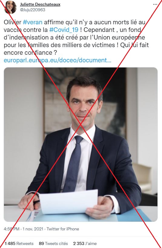 "Olivier Véran affirme qu'il n'y a aucun mort lié au vaccin contre l[e] Covid-19. Cependant, un fond (sic) d'indemnisation a été créé par l'Union européenne pour les familles des milliers de victimes !", écrit le 1er novembre sur Twitter Juliette Deschateaux, fondatrice du collectif étudiant contre la dictature sanitaire (EMLU). Elle accompagne sa publication d'une photo du ministre de la Santé ainsi que d'un lien vers une proposition de résolution du Parlement européen.