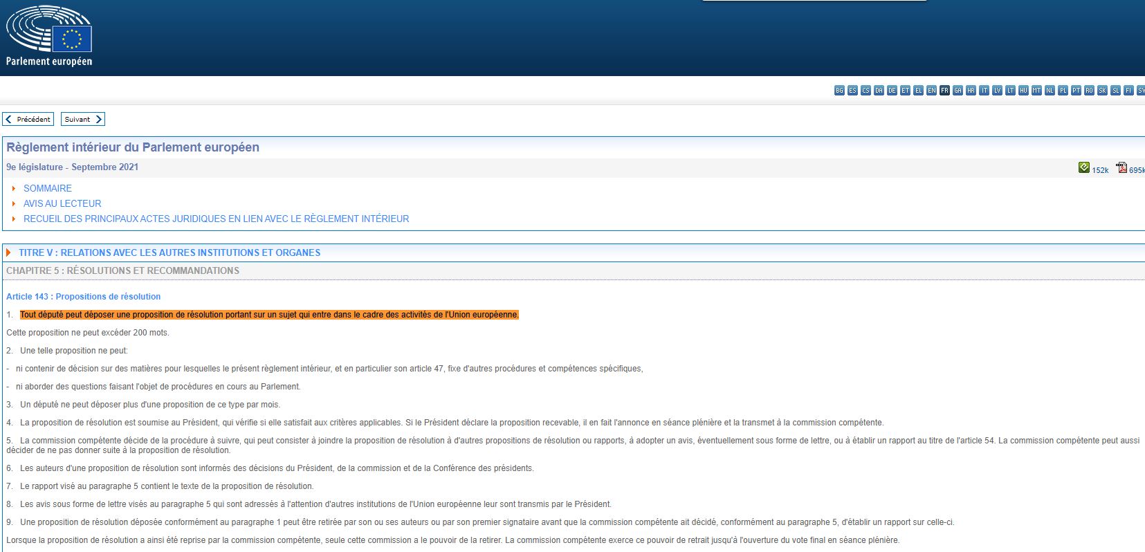 En effet, conformément à l'article 143 du règlement du Parlement européen, "tout député peut déposer une proposition de résolution portant sur un sujet qui entre dans le cadre des activités de l'Union européenne", jusqu'à une fois par mois.