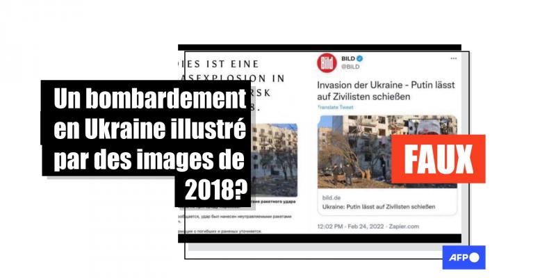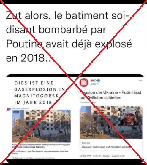 Mais attention, contrairement à ce qu'affirment ces publications, les photographies diffusées par le quotidien Bild ont bien été prises en Ukraine en février 2022. L'immeuble détruit par une explosion de gaz en Russie en 2018 n'a aucun lien avec le bâtiment touché par des bombardements russes en Ukraine, excepté une apparence similaire.
