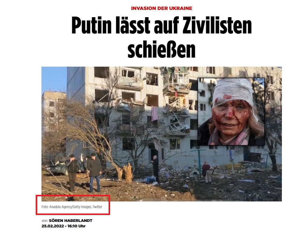 Le 25 février 2022, le journal Bild a bel et bien publié un article faisant état des dégâts causés par le bombardement d'un bâtiment en Ukraine. Afin de sourcer les images qu'il a diffusées, le quotidien allemand mentionne en légende le réseau social Twitter et l'agence de presse turque Anadolu.
