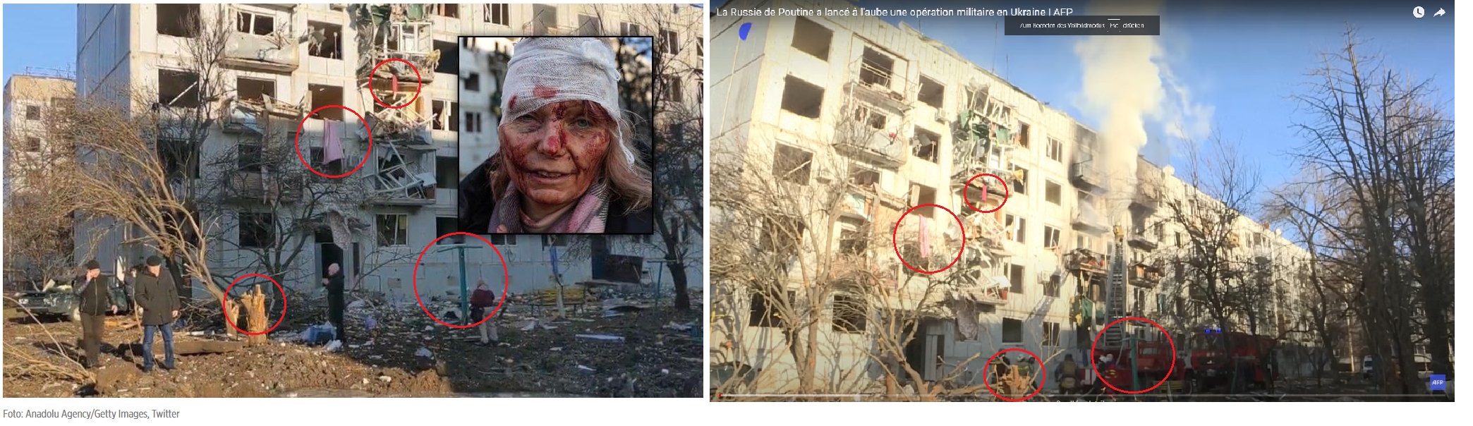 Par ailleurs, une comparaison entre une photographie de l'AFP (à droite) et celle de l'article de Bild (à gauche) permet de certifier qu'elles montrent toutes deux le même immeuble, frappé à proximité de Kharkiv, le 24 février 2022.