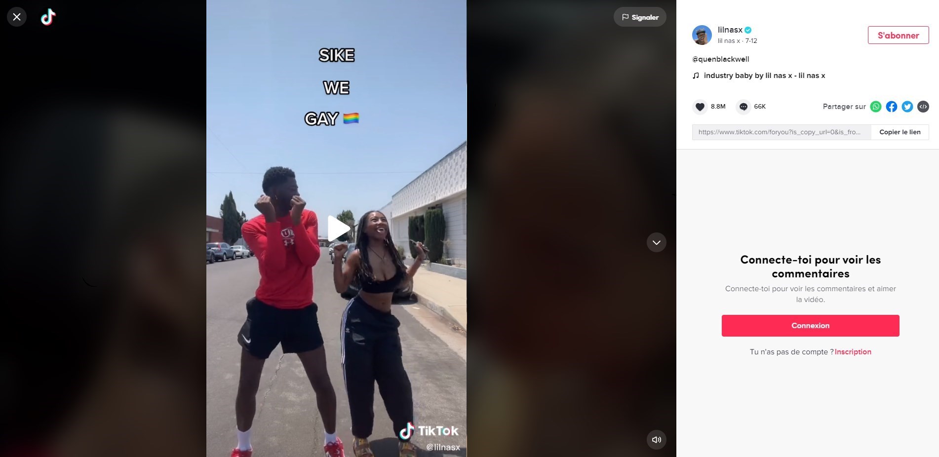 Dans ces quelques secondes de vidéo, on voit le chanteur et une de ses amies dans une voiture, faisant mine de s'embrasser. Lui porte le même haut rouge que dans les images que nous vérifions. Juste avant le baiser, les premières notes de sa chanson "INDUSTRY BABY" retentissent puis les deux protagonistes se mettent à danser. Les mots "SIKE WE GAY" ["On vous a eu, on est gay"] accompagnés d'un drapeau aux couleurs de l'arc-en-ciel, traditionnellement emblématique des mouvements LGBT+, apparaissent ensuite à l'écran.