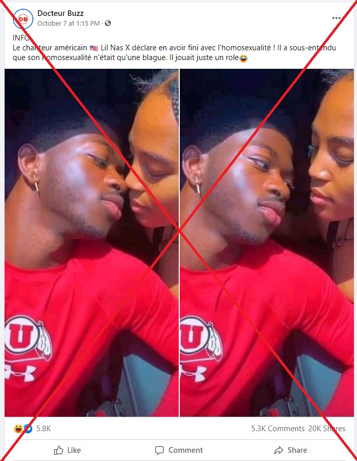 Des publications partagées plus de 20.300 fois depuis le 7 octobre prétendent que le rappeur américain Lil Nas X, mondialement connu pour son hit "Old Town Road" en 2018, a déclaré "en avoir fini avec l'homosexualité". Depuis son coming-out en 2019, le chanteur revendique fièrement et sans tabous son orientation sexuelle sur les réseaux sociaux, dans ses chansons et ses clips. La photo qui accompagne les publications virales où on le voit à deux doigts d'embrasser une femme est tirée d'une vidéo TikTok qu'il a en réalité publiée pour plaisanter. Il continue d'ailleurs de parler de son homosexualité sur les réseaux sociaux.